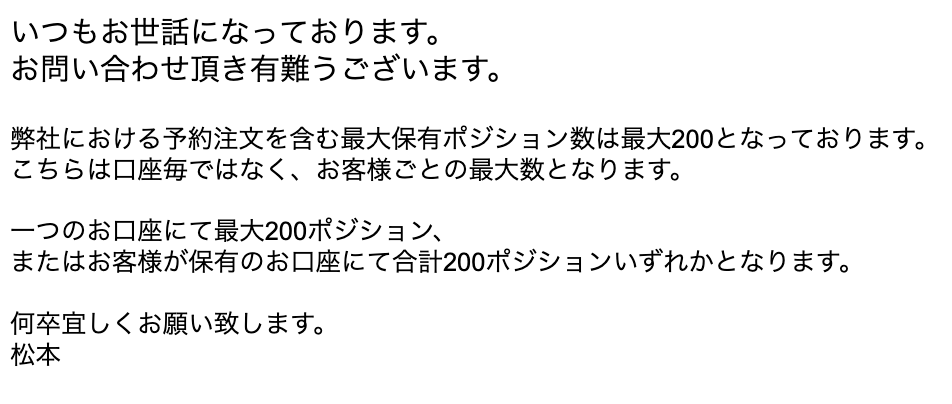 本システムのみで200ポジションを保有することはありませんが、他のシステムなどを同時にお使いの場合はあり得るかもしれませんので、複数のシステムをお使いの方はご注意ください。