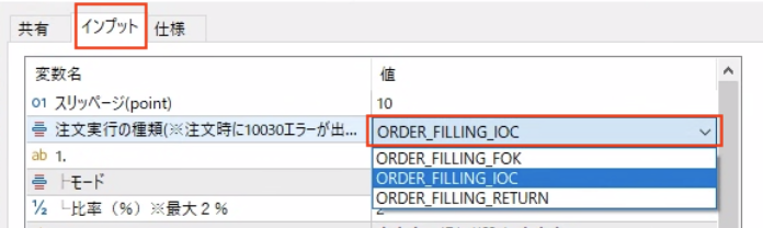 デフォルト設定では「ORDER _FILLING _IOC」にさせていただいていますが、利用者様の方で設定を行っていただく際にミスクリックなどで変わってしまっている場合があります。