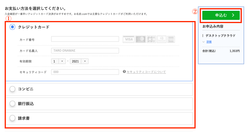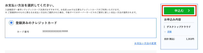 アカウントをすでにお持ちの方の場合は下記のようにクレジットカードなどの情報が出てきますのでお支払いになられる方法を選択肢「申込む」をクリックしてください。