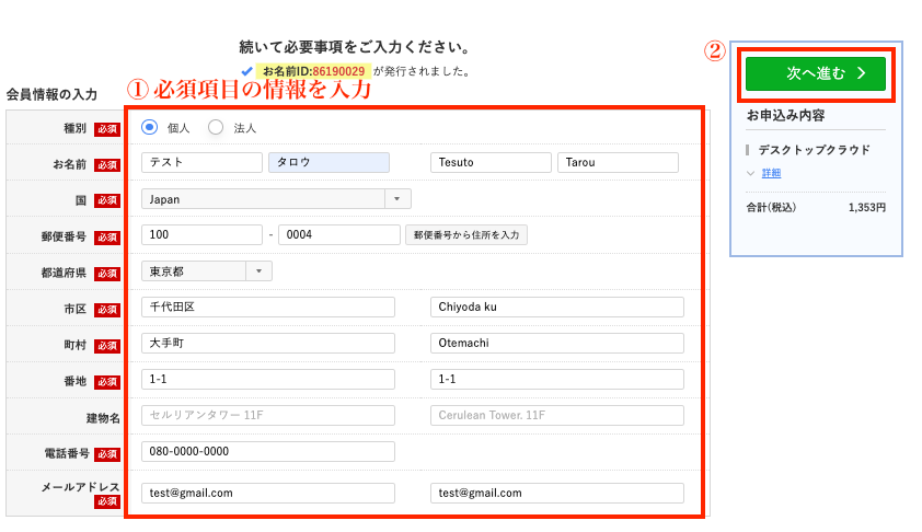 下記のように必須項目の情報を入力し、「次へ進む」をクリックします。